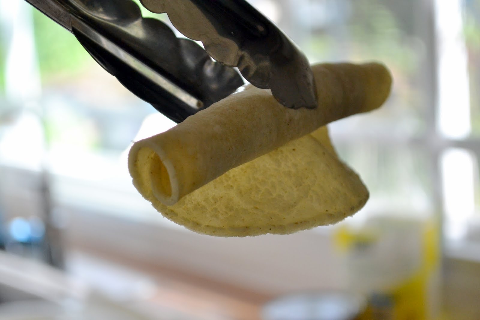 Taquitos should take approximately 5 minutes to brown on one side (takes longer for a larger pan). Once brown on one side, flip with the tongs.