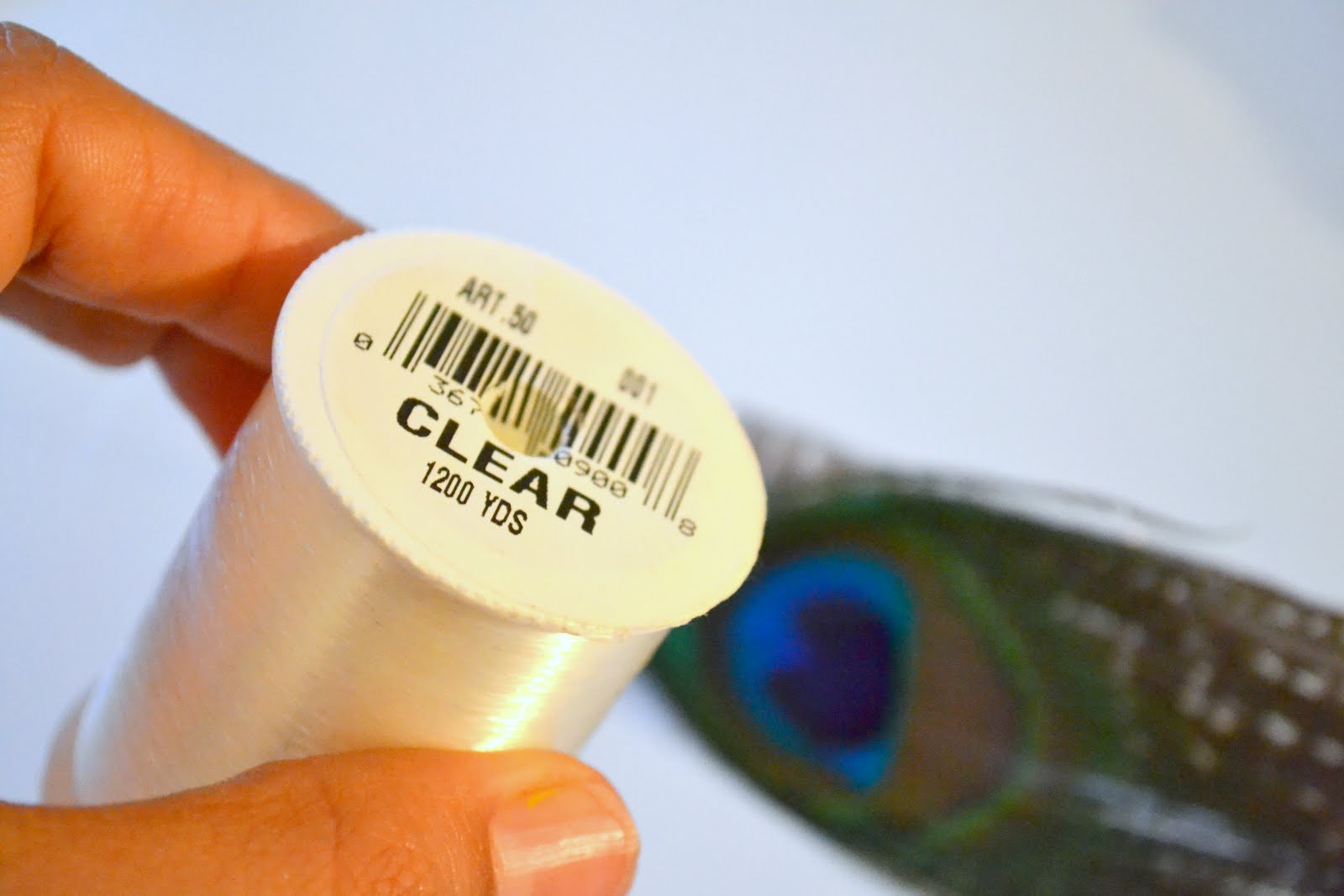 First, take your clear thread and measure about four inches longer than you actually want your feathers to hang. For example, I wanted my feathers to hang about 2.5 inches from the base of my headband–so I cut the thread at 6.5 inches.