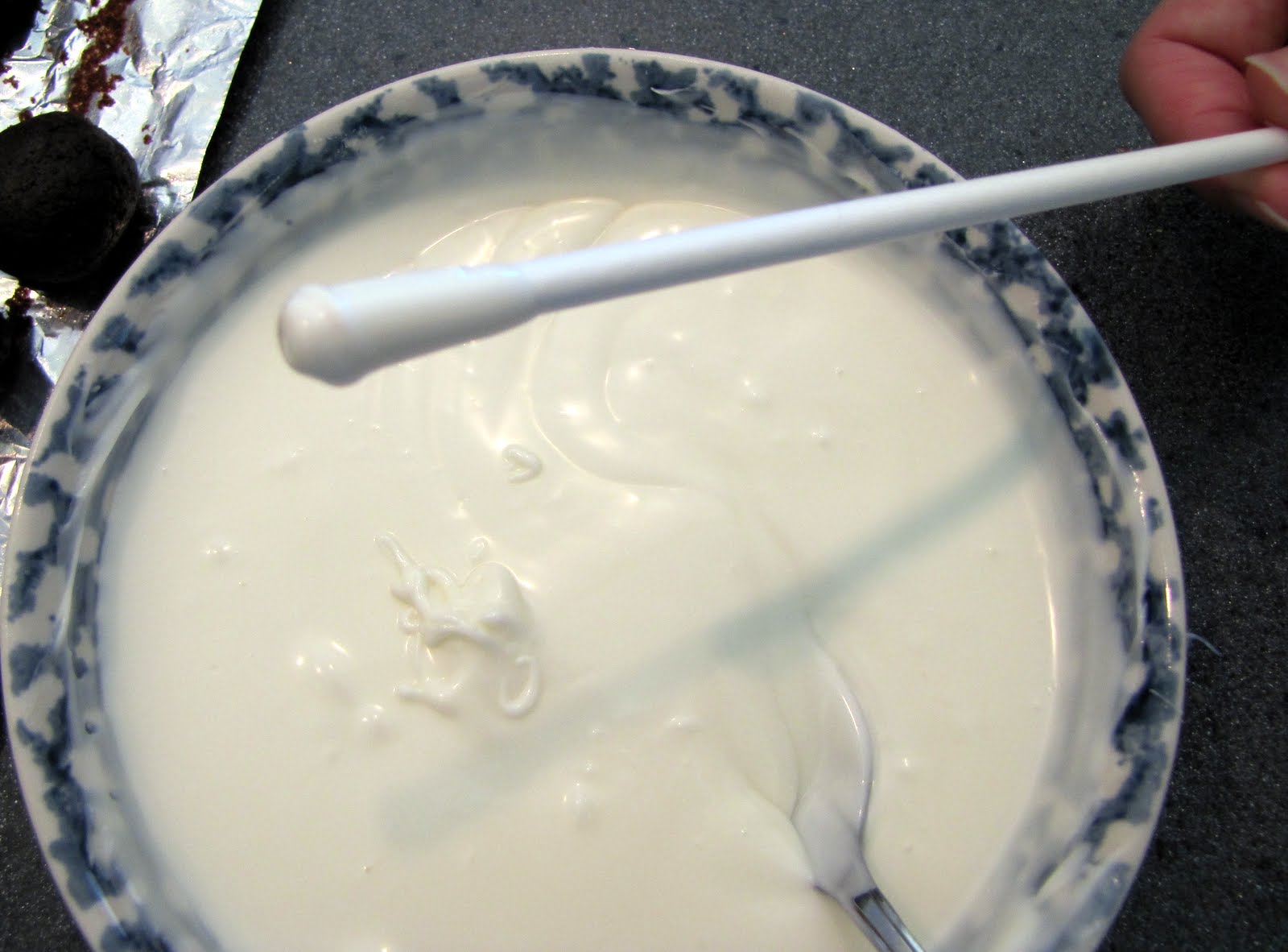 Now you are ready to coat your cake pops in the delicious white chocolate.