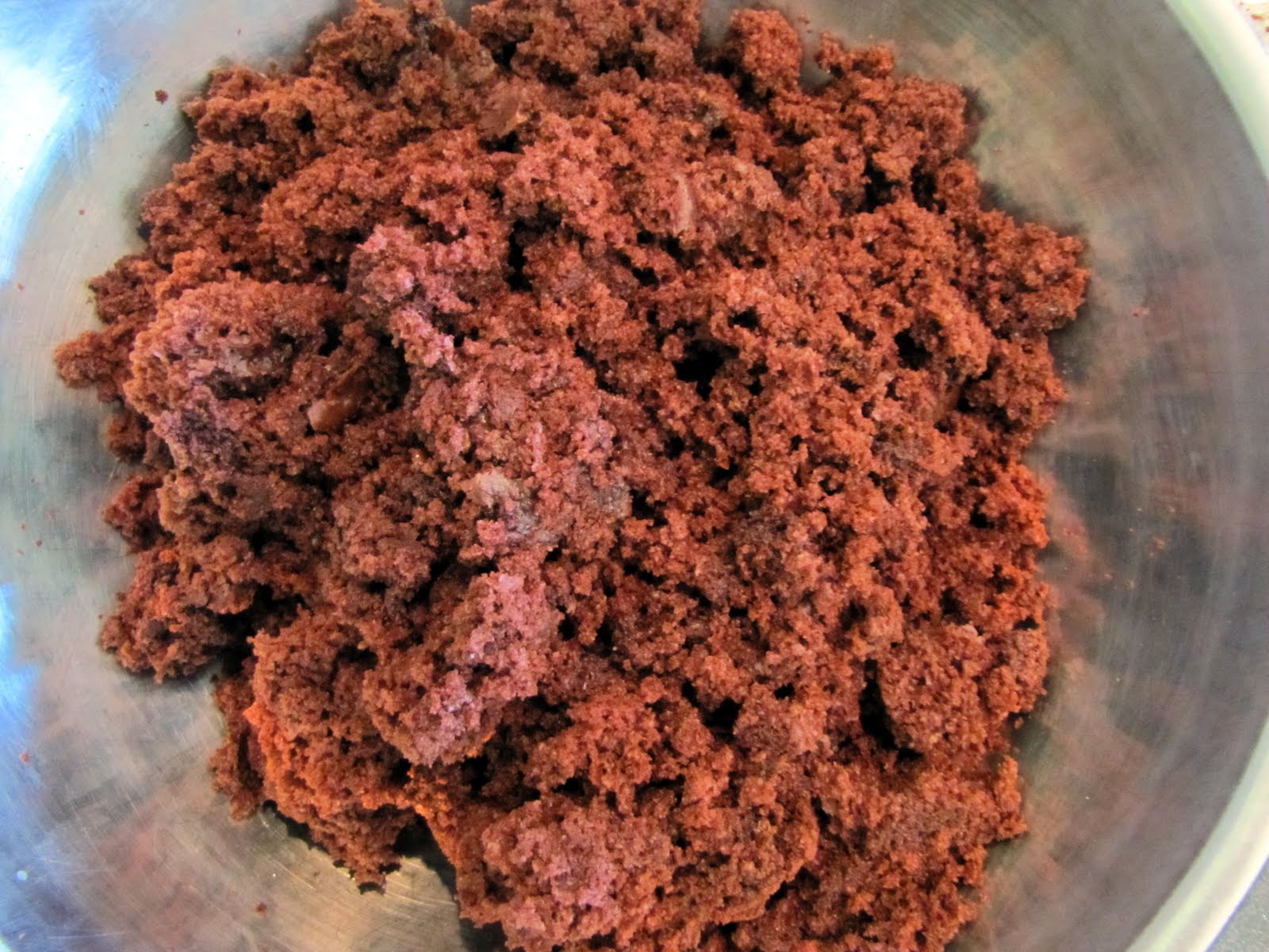 - Put your baked cake in a large mixing bowl. Use your hands to crumble the entire cake. Add about ½ of the package of chocolate frosting to the crumbled cake. Use your hands to mix the frosting evenly throughout the crumbled cake mix until the cake mix is well moistened. Your cake mix should be moist enough to shape into a large mound and keep its shape.