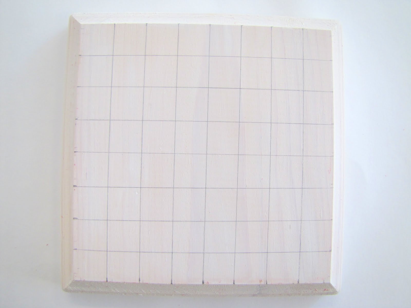 You will need to measure off your boxes. Take the number of inches long of your plaque and divide it by 8. This will give you the necessary width of each of your boxes. For example: if your plaque is 6×6 inches, take 6 inches divided by 8 boxes and you get .75. This means each box will be 3/4 of an inch wide.