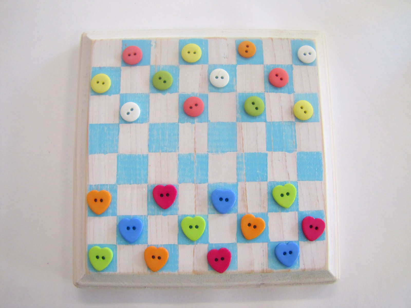 I hardly remember how to play checkers, but I sure had fun making this cottage chic distressed checker board with button pieces! I was cleaning out my garage and stumbled across my current checker board–BORING and frankly, quite ugly!