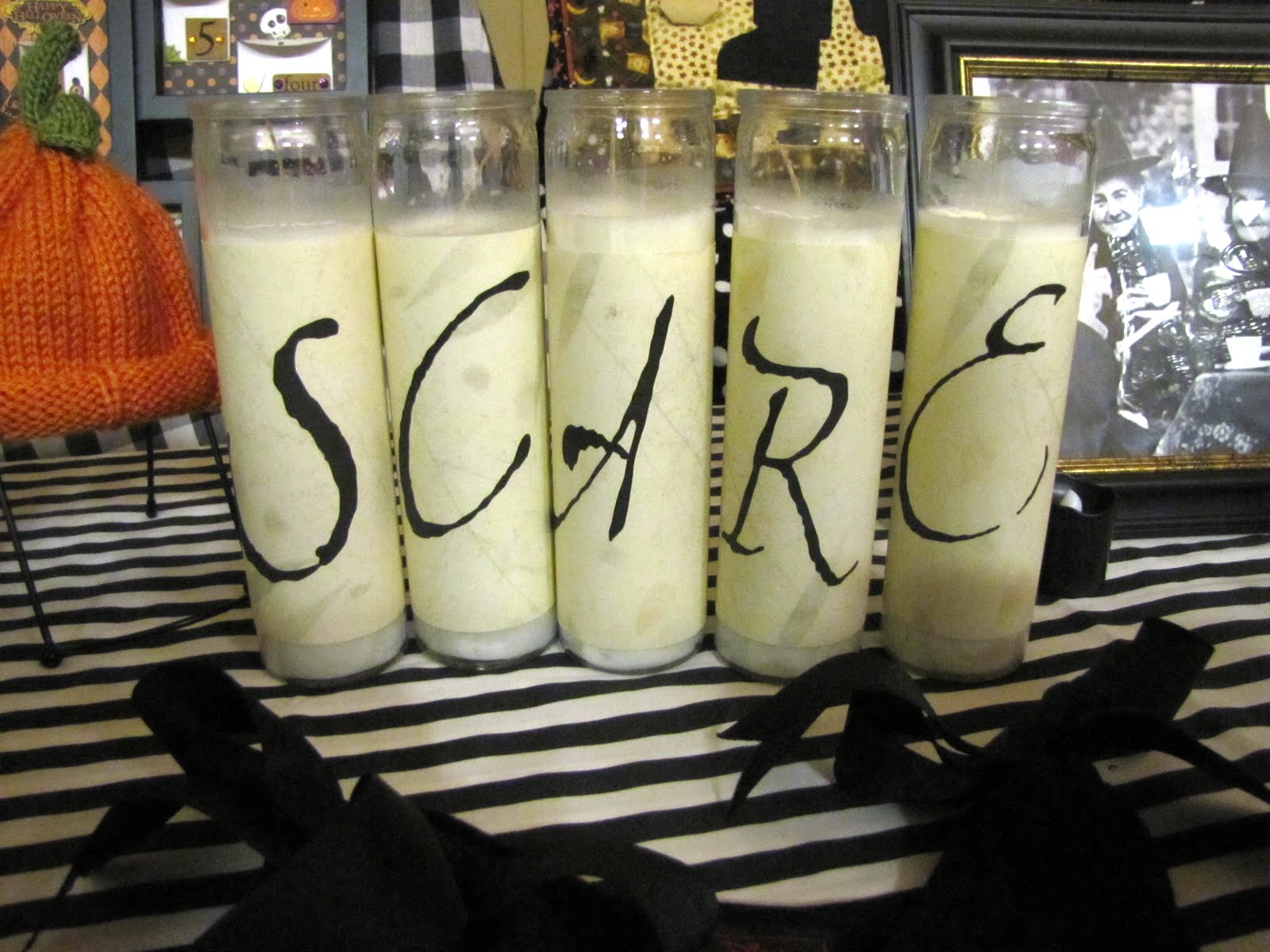 Wrap spooky font around dollar store candles.