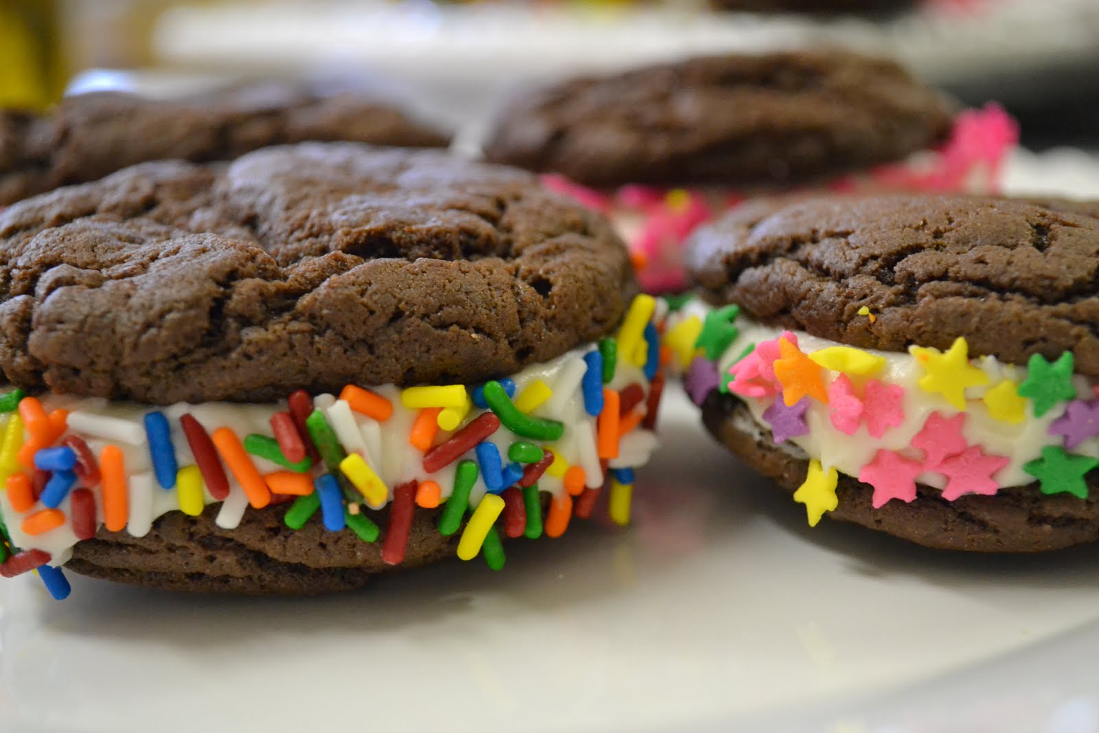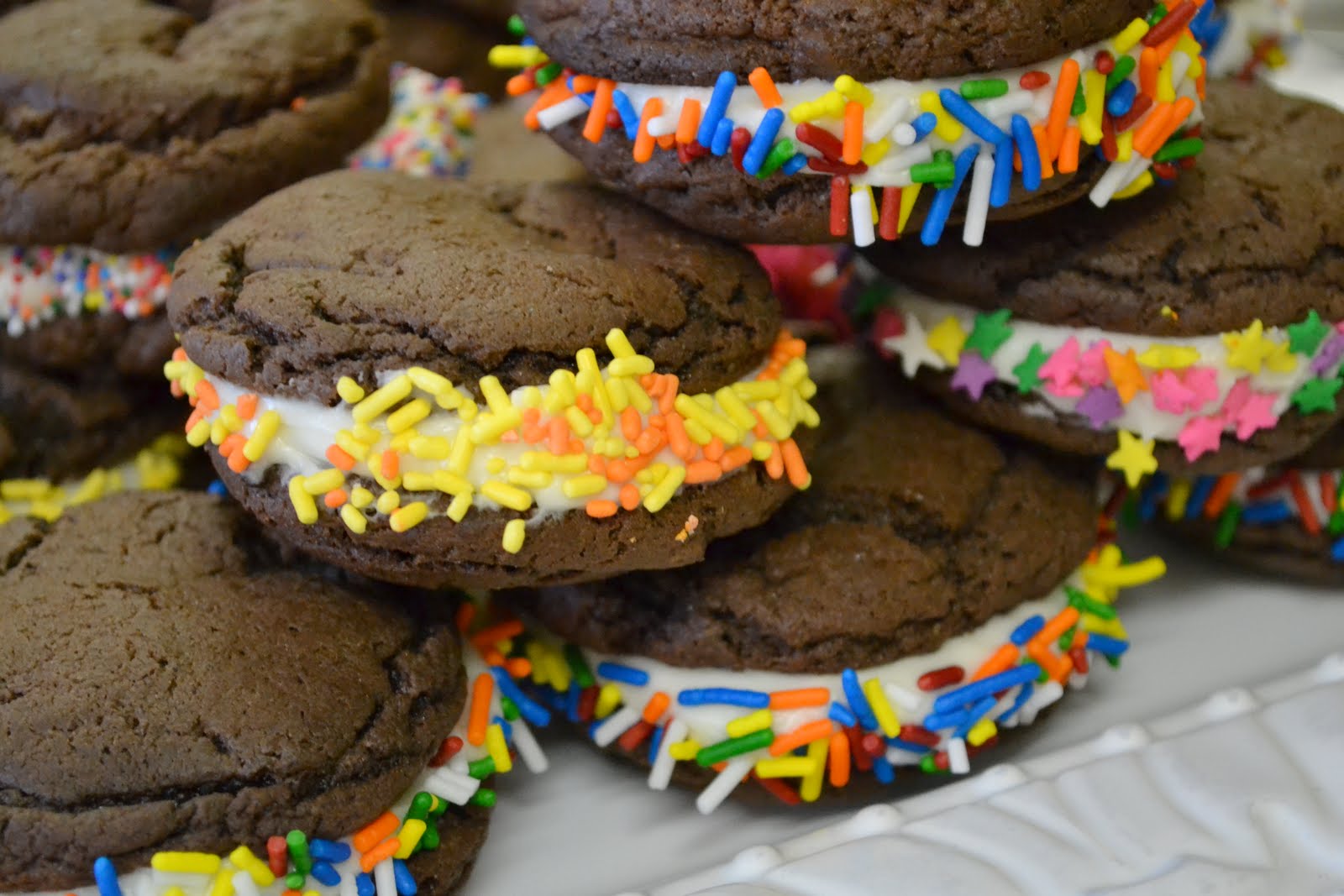 - Take your cooled whoopie pies and apply a large dollop to one side using the plastic bag. Put the other whoopie on top. Add your favorite sprinkles (optional).