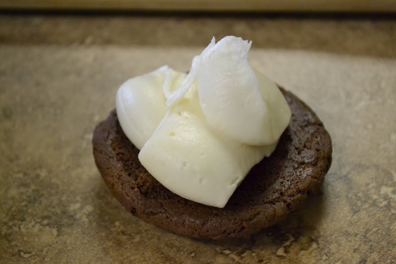 Take your cooled whoopie pies and apply a large dollop to one side using the plastic bag.